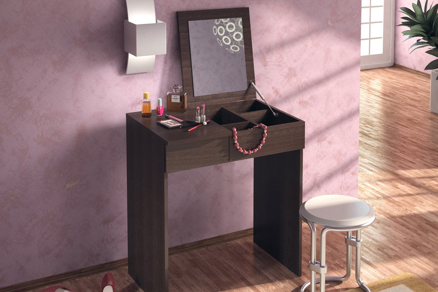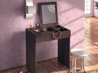 Such a component of furniture as a dressing table, can be sold in various variations. For example, Some models are integral with a mirror design, while others imply a separate mounting of the mirror on the wall. The second option is more convenient because the table, seat and mirror can be purchased separately, forming a more interesting set and saving on purchase. The console is sometimes sold and generally without a mirror. The latter is purchased small, desktop. This option is cheaper and more convenient for someone.