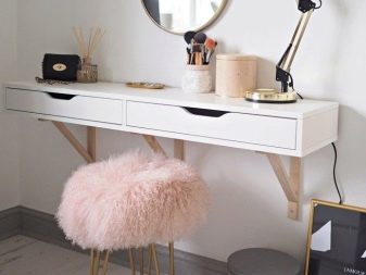 Of course, it is important that the dressing table looks good with the other furniture chosen for the room. However, this does not mean that the material should be absolutely the same. The same applies to the color scheme. Sometimes a contrast solution, on the contrary, will even look more advantageous. Most often for this piece of interior is selected wood, fiberboard or MDF, plastic.