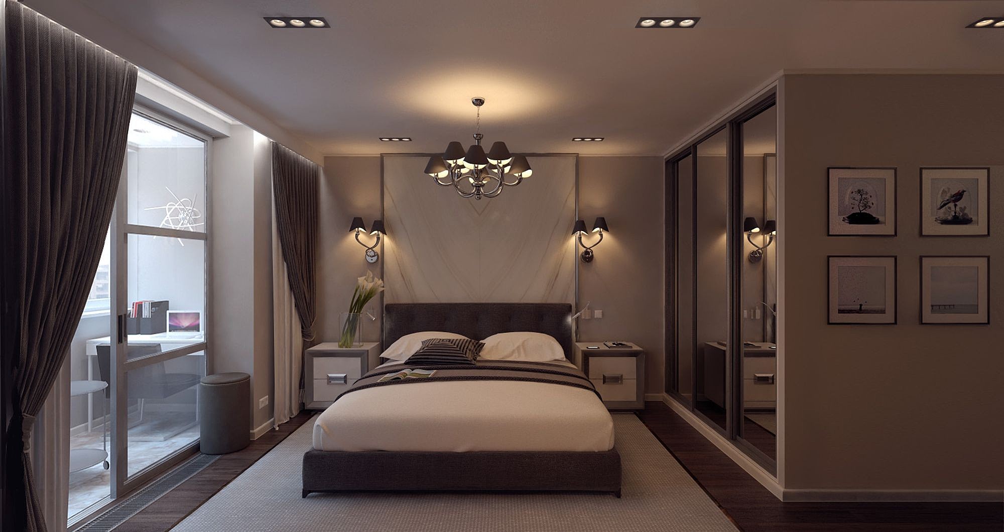 This option is very comfortable and implies the possibility of highlighting specific areas required. The chandelier in the bedroom, as well as auxiliary light sources, largely determine the comfort and coziness that will dominate the room in the evenings, which will directly affect a serene dream.