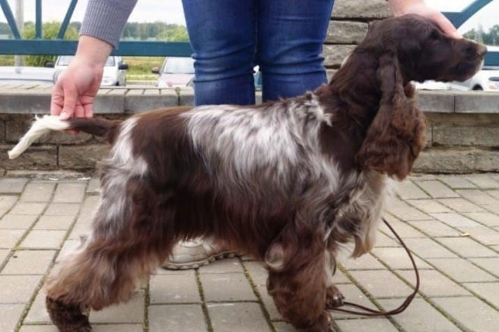 In the paw area of an English Cocker Spaniel, wool is clipped. according to a certain pattern. On the hind legs, the length is maintained to the hock, all that is below is shortened. On the front limbs, wool is clipped from the sides, tail hairs, cut off at an angle of 30 degrees, remain behind. Short sections are trimmed.