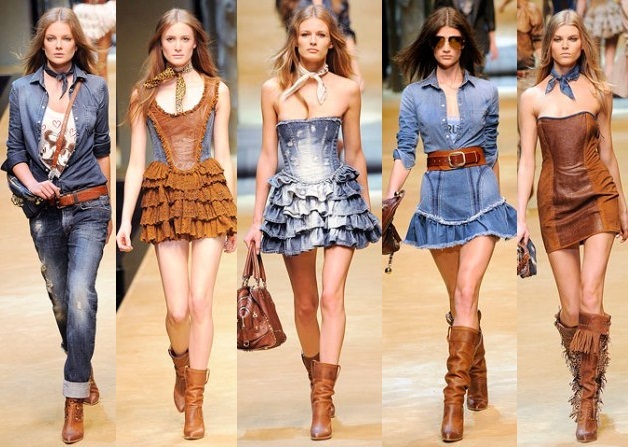 Pure cowboy style is not used. High rough boots, wide-brimmed hat, leather belt look quite aggressive. However, the notes of the cowboy world can bring a zest to the image. For example, it can be a hat-style hat adapted to a woman’s style or light brown high-toed boots.