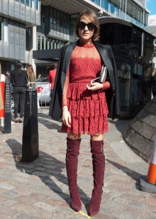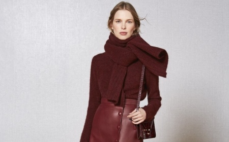 A sensual and feminine look is made using a burgundy or dark red high neck sweater and a high waist leather skirt. You can complement the laconic set with a small bag over the shoulder and a warm scarf in the color of a sweater.