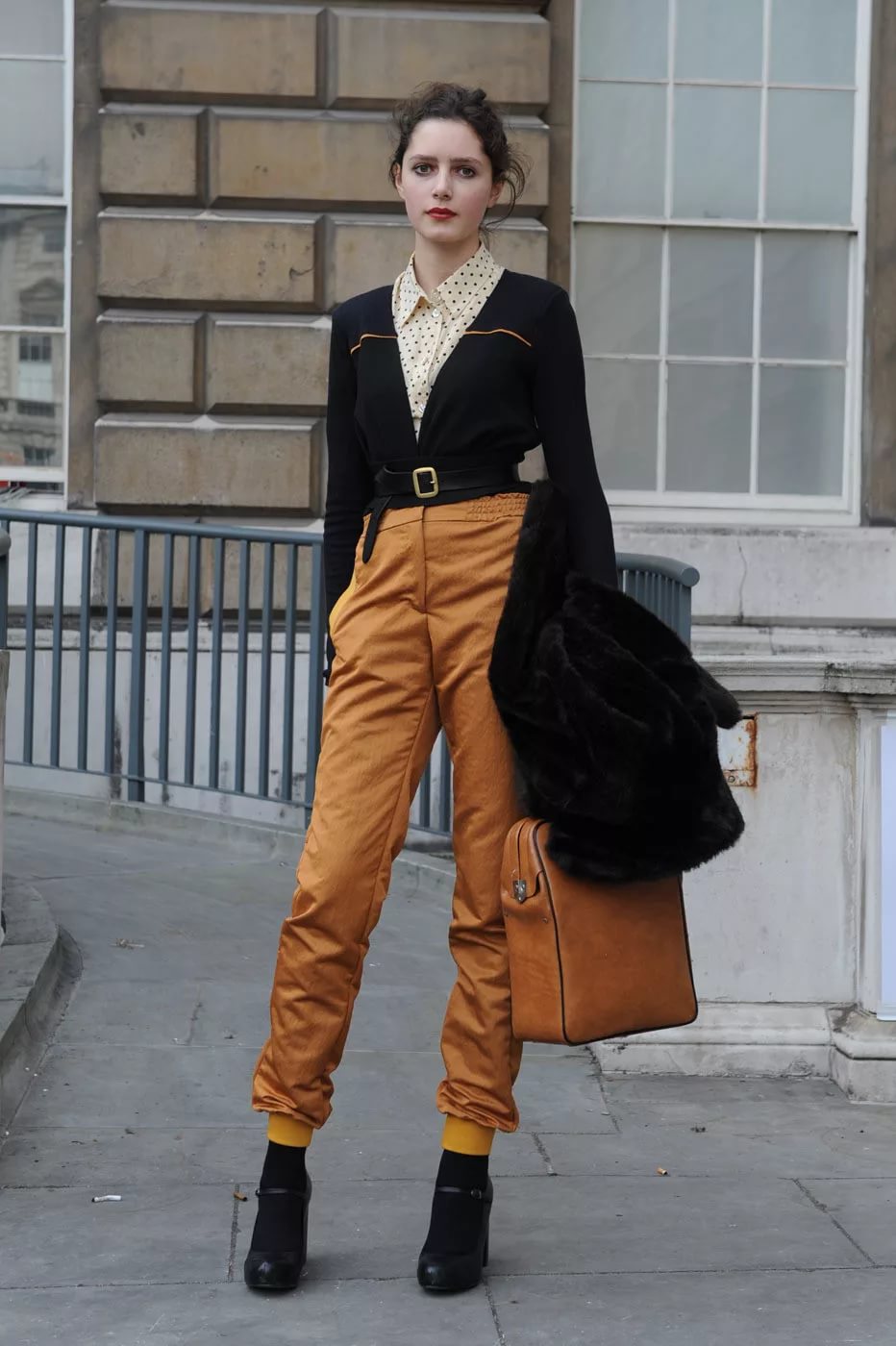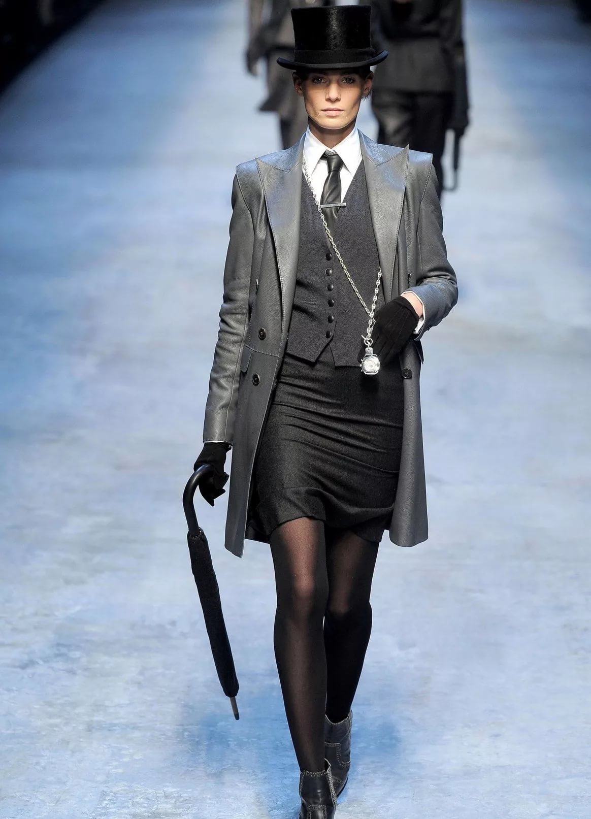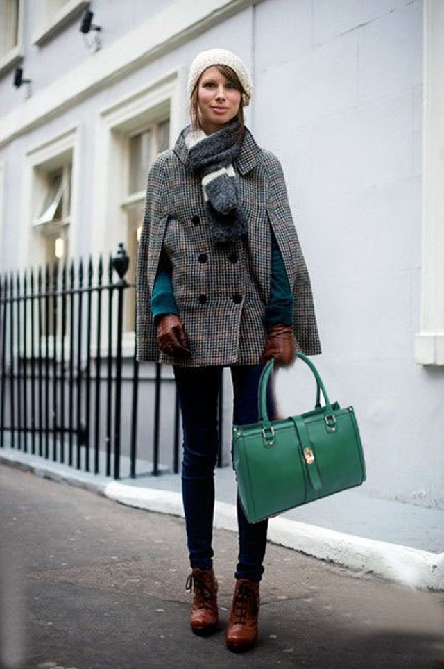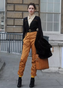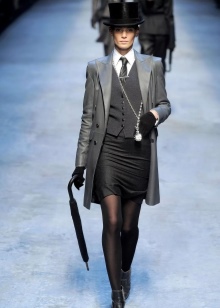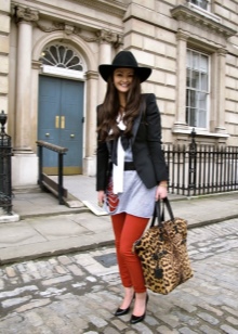 If you want to look feminine and sexy, then you should turn to an effective combination of a pencil skirt, blouses with a discreet print and a leather jacket with a fitted cut. From the shoes you should choose leather ankle boots with high heels and platform. You can complement the spectacular image with an umbrella-cane, a small round hat, leather gloves and a small square clutch.
