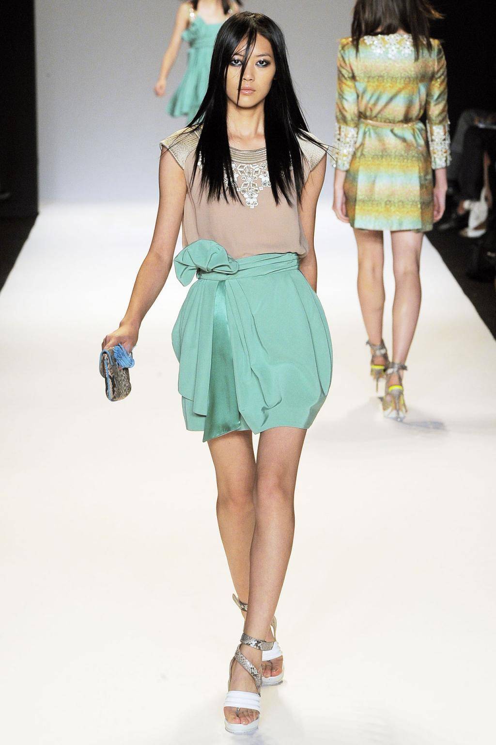 Flirty court shoes can be worn on the feet. They should match the color of the bag or suit.
