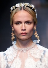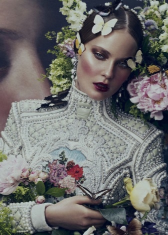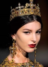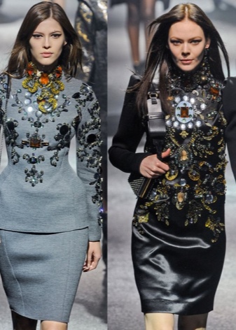 In addition to luxurious dresses, many modern designers offer elegant costumes with baroque decoration to create an evening look for women. Bundled hair can be decorated with a massive decoration in the same style, but the makeup should not be too cheeky.