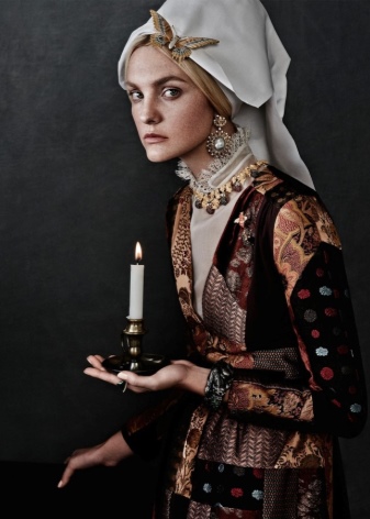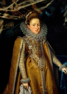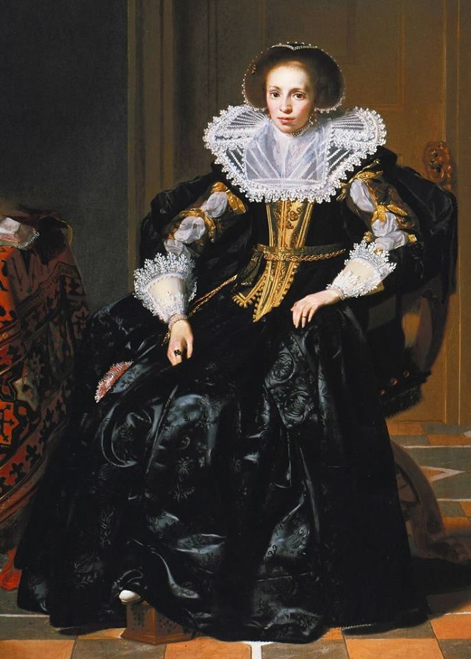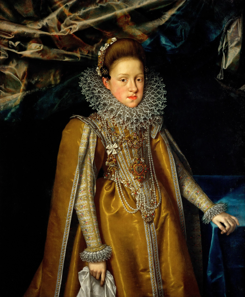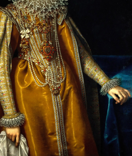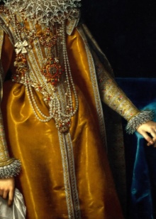 Dresses of the time were made of noble brocade or silk fabrics and decorated with ornate patterns that were embroidered with golden or silver threads.