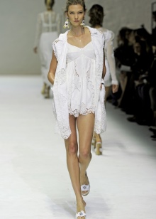 Usually, clothes of such a direction are made of delicate and beautiful fabrics: silk and satin, as well as chiffon or satin. The decor of such products is minimized and is usually limited to inserts of guipure or lace, as well as embroidery. If the clothes are made of transparent fabrics, then the effect of layering is used to avoid excessive frankness.