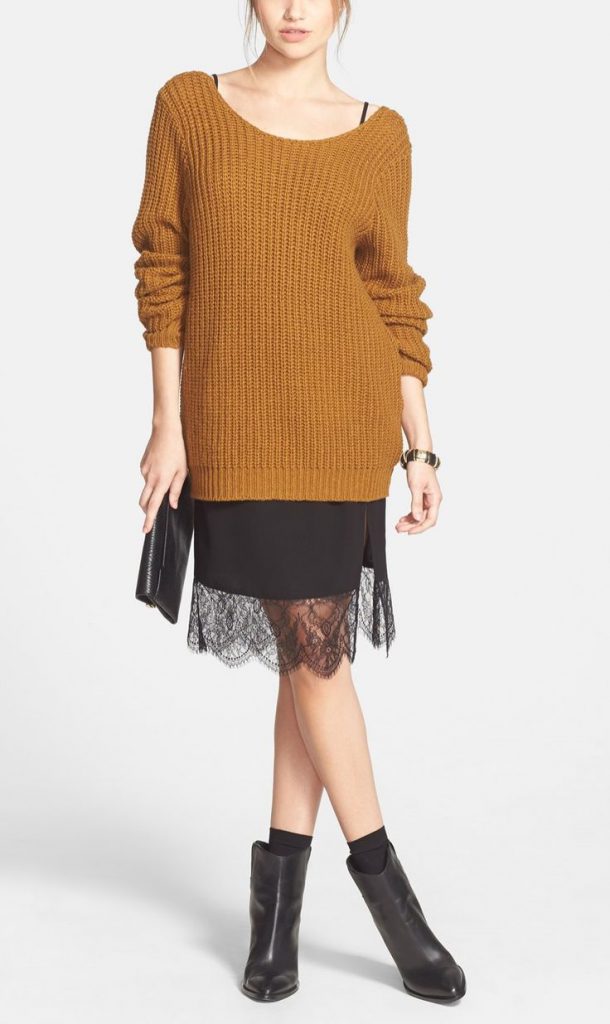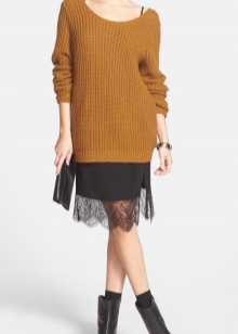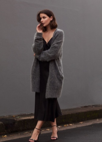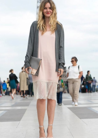 - In winter, wardrobe items that resemble underwear fit well with knitted items. Choosing a volumetric knitted cardigan for a dress with lace you can create a very feminine and sophisticated image.
