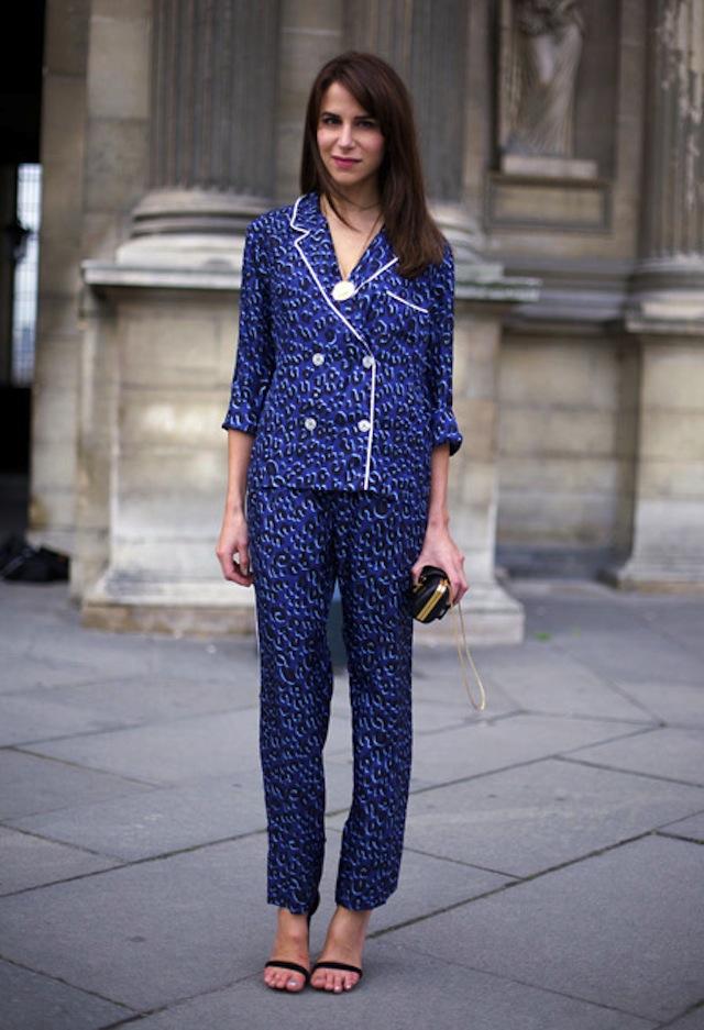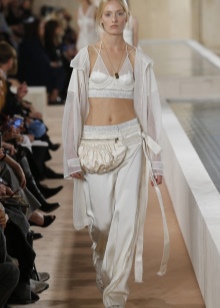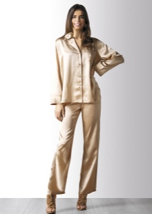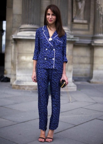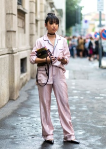 A light silk suit in pajama style is perfect for evening promenades in the warm season. The free cut of such clothes allows you to choose ballet flats, moccasins or sandals on a flat sole to suit. Deep dark shades or the presence of floral or other prints are welcome for pajama sets.