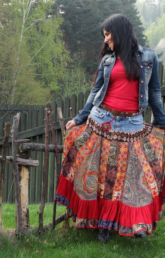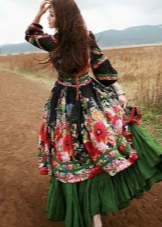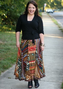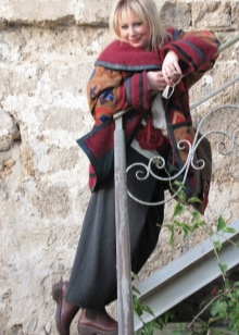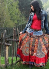 In summer, you can wear a flared skirt of maximum length with a linen or cotton blouse decorated with lace, ruffles, ethnic ornaments or fringe. The knitted bolero and sundresses of a free cut are perfectly combined.