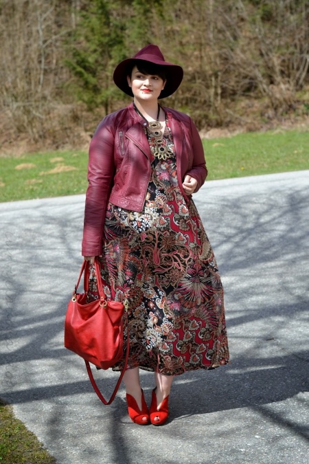 For example, an extremely effective option would be a maxi dress with a straight silhouette with a floral print. Due to the thin material, it will not create a volume effect. The stylish addition in this case will be the elements of the grunge style - a scarlet leather jacket in combination with a bag and shoes of rich red color. The main decoration is a wide-brimmed hat and a massive ethnic necklace. Great new hippie image for a walk around the city.