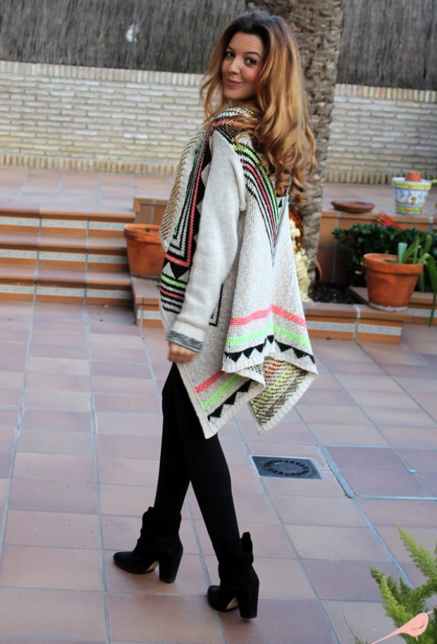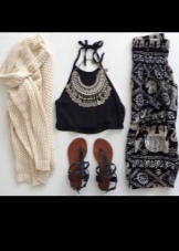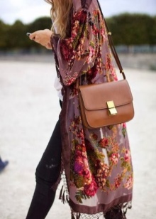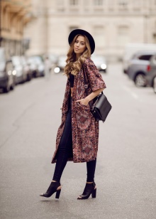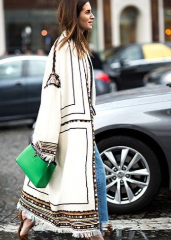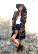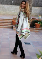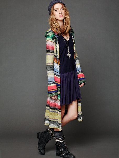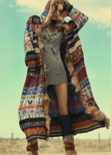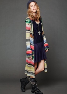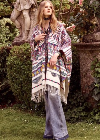 Outerwear (poncho, capes) is often similar to rectangular capes. The down jacket or patchwork type jacket looks interesting and impressive in the off-season. For cold days, you can buy a knitted cardigan in your wardrobe. The best choice is a knitted model made of thick yarn.