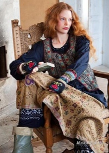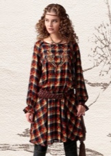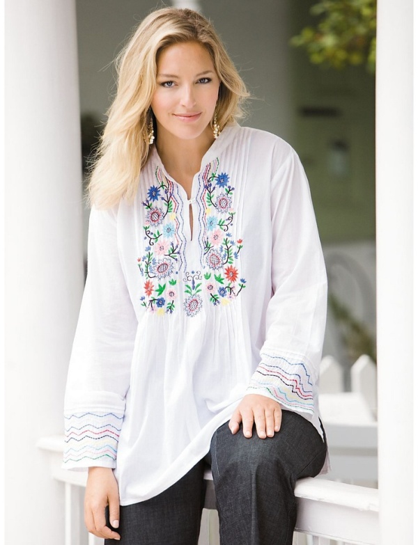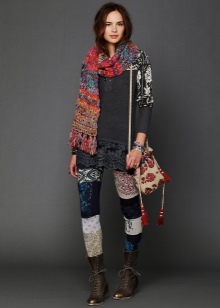 - Tops with embroidery and crumpled texture of the material are considered a rarity of the usual wardrobe and are far from all. But the free knitted tunic silhouette trapeze, made in soothing shades, will become an indispensable attribute of the style of boho-chic. To create an outfit in the urban style, it is enough to wear this tunic with leggings tucked in high boots. And, of course, complete the bow with a small scarf or a small metal necklace.