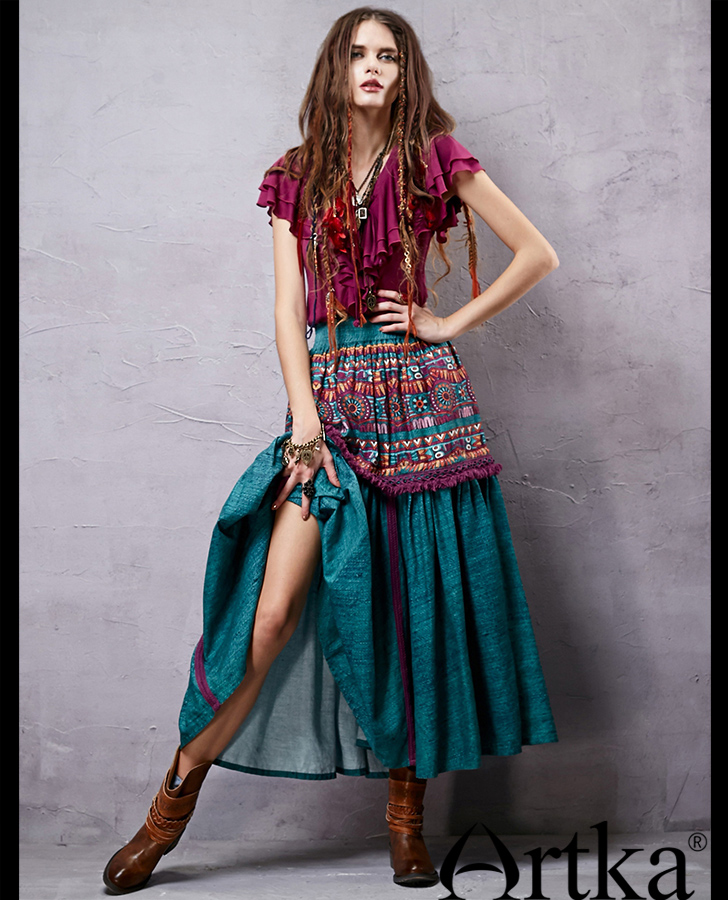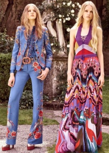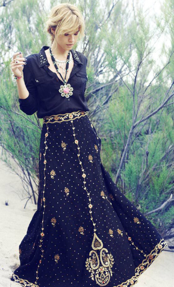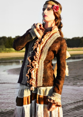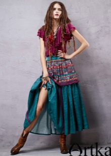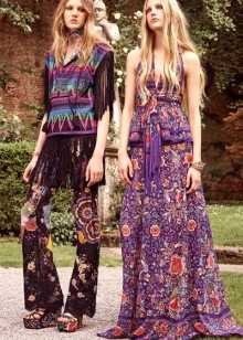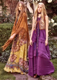 Bohemia dresses and skirts are amazingly gentle. More often they are long and variegated, with a bright ornament or a bright floral print. In this wardrobe a lot of things with high waistline, flared skirts, voluminous things and knitwear. The clothes often present fringe, lace, large decor, embroidery. The texture of the materials can be very diverse. Skirts are often multi-layered.