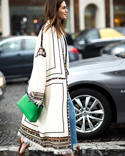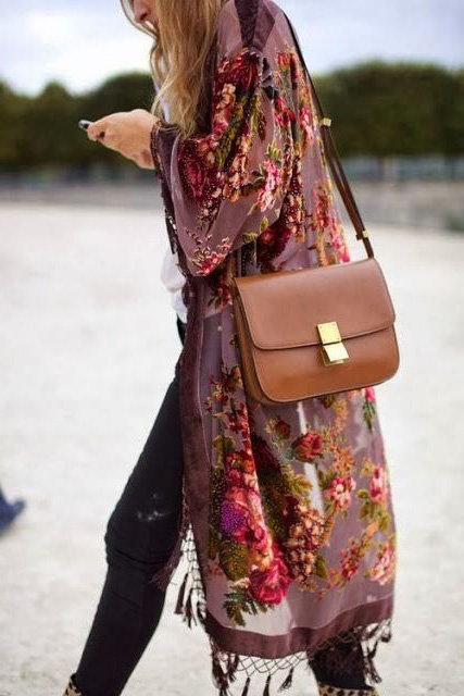 Office boho-style involves a combination of bohemian fashion and modern clothing. Instead of a plain jacket, you can wear a floral print jacket, a white top, dark trousers, and complete the look with a soft leather bag with a fringe, beads with turquoise and a ring with a large stone.