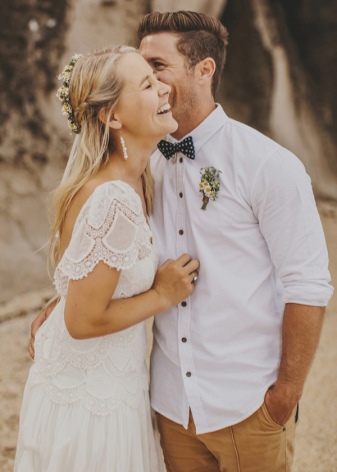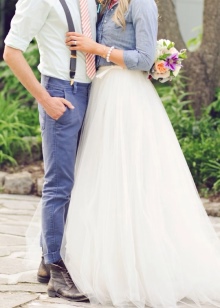 Brides in casual style can go two ways - choose complete ease or combine it with the classics. The first option is suitable for those who do not want to worry much about the dress and plans to wear it afterwards. The second way is to choose a traditional outfit and combine it with bright accessories - belt, headband, ribbons, flowers.
