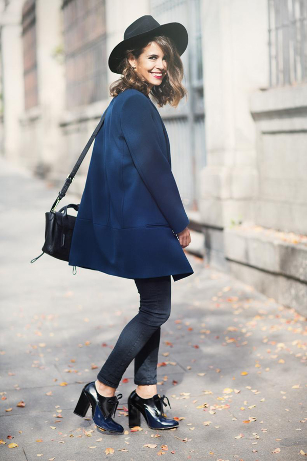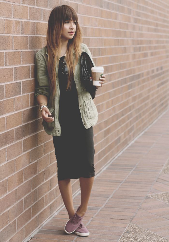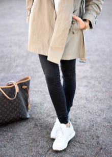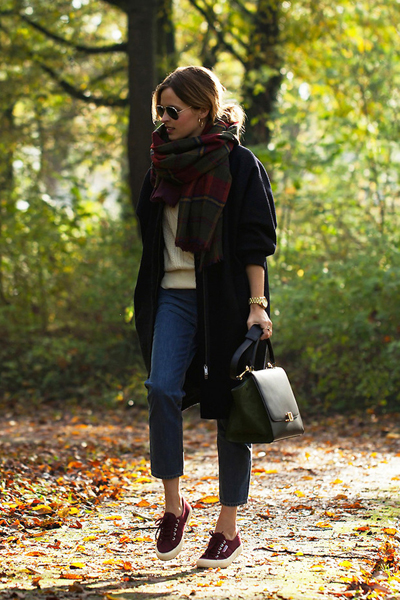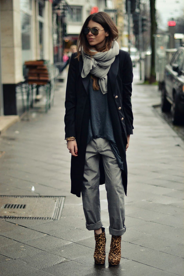 The woman who decided to combine black, gray and white colors will look irresistible and interesting. A black dress of medium length, a warm woolen cape, white sneakers, glasses and an unusual cap will make you look stylish in the street.