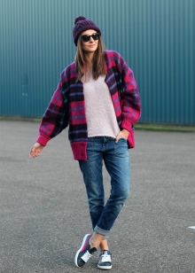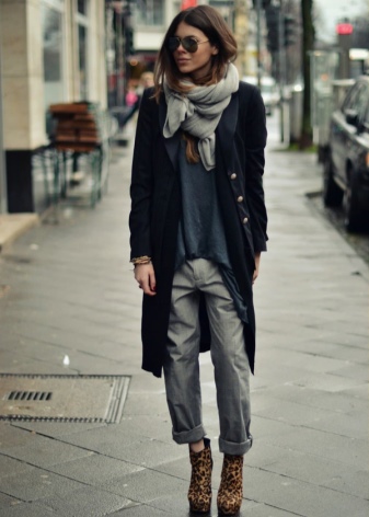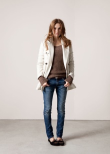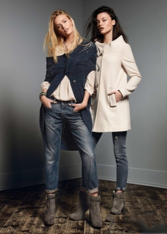 In the cold autumn and winter time, the casual wardrobe includes knitted sweaters, warm woolen dresses, an oversized coat. In combination with jeans looks interesting and a hoodie. For cold weather, the base winter wardrobe must include dark jeans, a few light tops, a knitted sweater and outerwear — a coat, cardigan or jacket. It is recommended to select a contrasting color palette, for example, a beige top and a dark blue bottom.