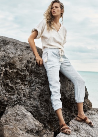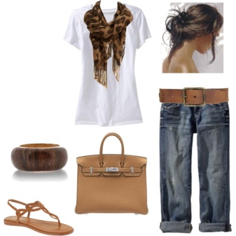 Trendy summer bow will provide a combination of a spacious light tunic with tucked jeans. Pointed-light, ballet flats, a beige clutch bag, an original scarf and sunglasses will create a calm and delicate ensemble.