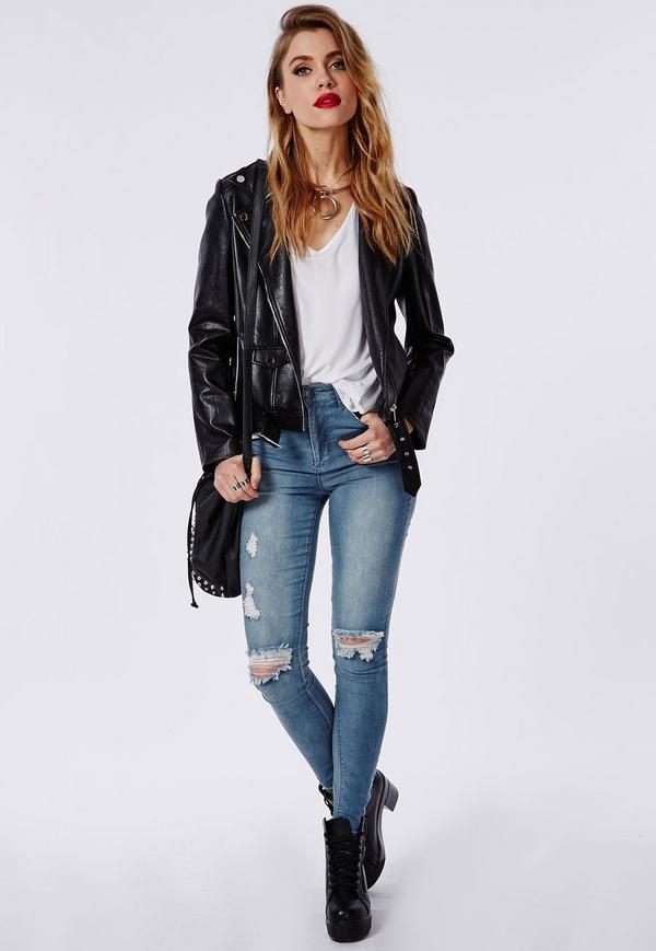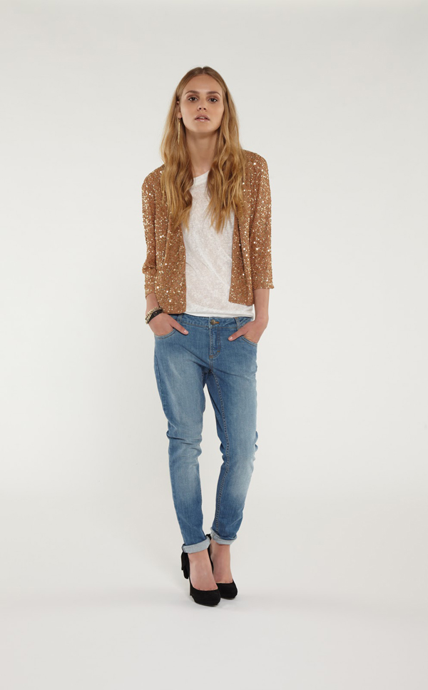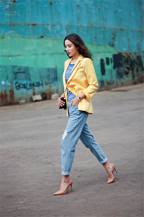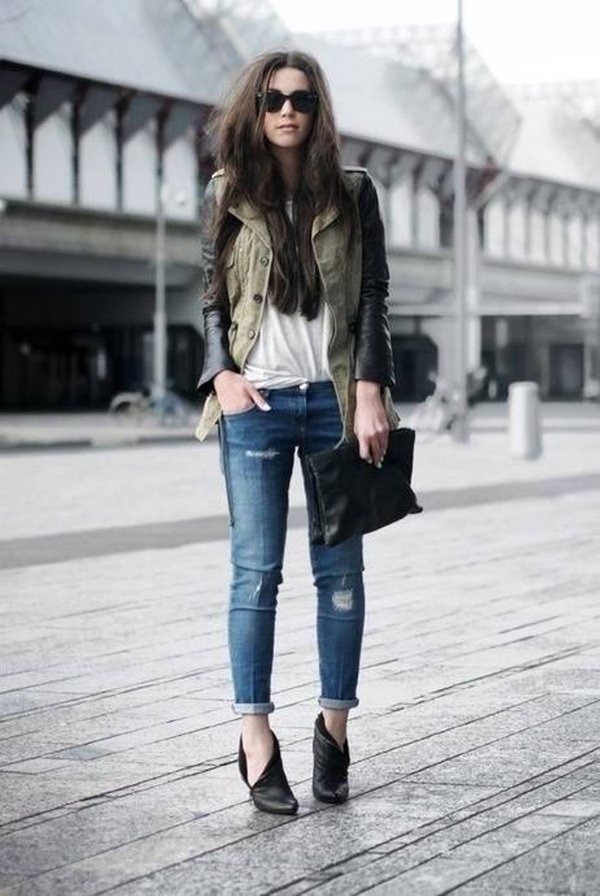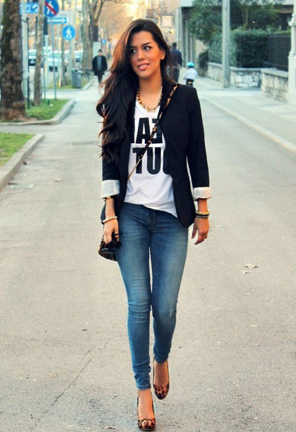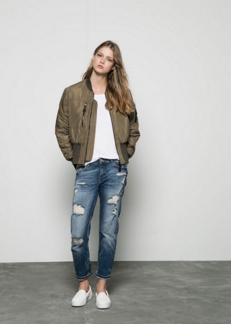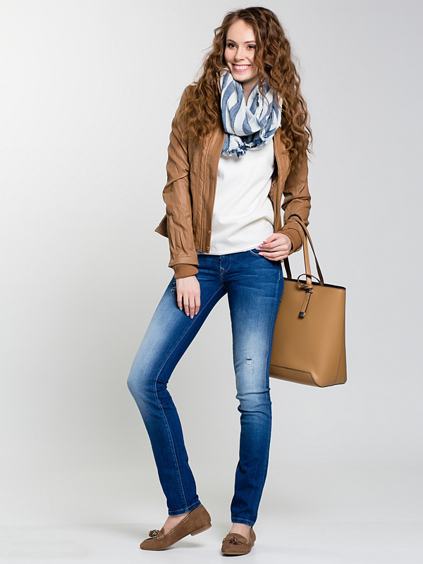 In the spring and cool summer, a combination of high-waisted jeans and a light colorful blouse will create an interesting fresh look. It can be supplemented with a denim jacket and white floral slip-ons. From accessories fit small beige handbag.