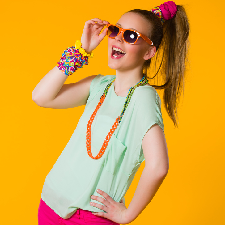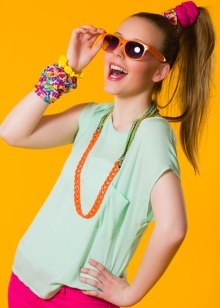 For this style is used not only clothing that attracts attention, but also accessories with the same task. Mostly accessories were, of course, girls and girls. Mostly wore a large number of bracelets and all at once, a lot of chains, large earrings, either colored or imitating gold, glasses of irregular shape and colored glasses.