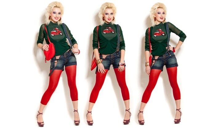 More options for a fashionable image for a woman - a combination of short shorts and bright tights or leggings, T-shirts and pants in bright colors, denim sundresses.