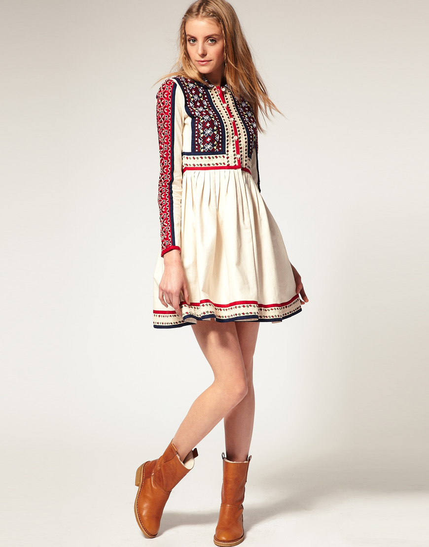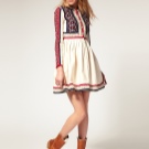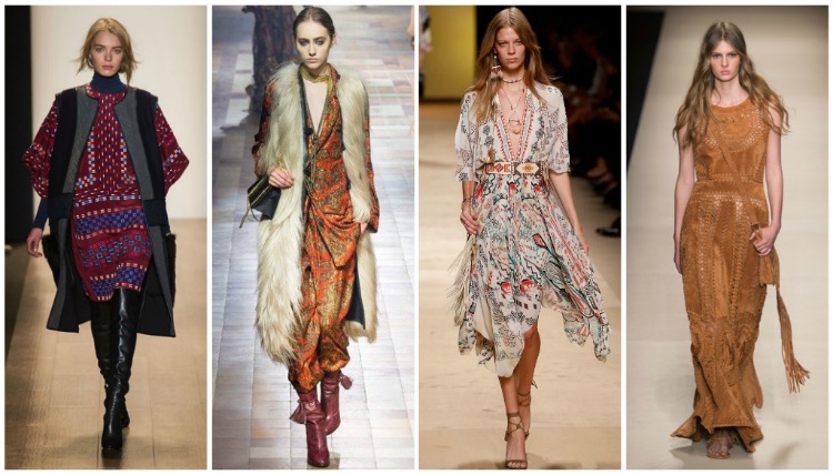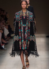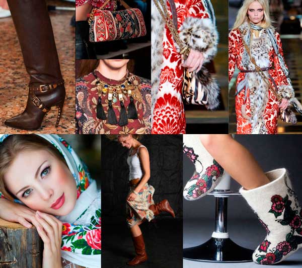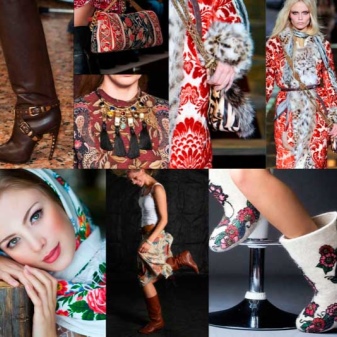Among the things in ethno-style there is always a dress or sundress of an A-line and a bell skirt with a decorated hem. The choice of accessories is also rich: all sorts of bright scarves, hats with fur, kerchiefs, bags with embroidered ornaments, woven sandals, boats, ankle boots with fur trim.