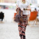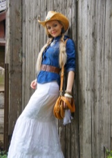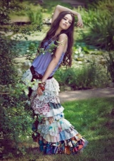 The original ethno-image can be created from a short snow-white top and a long skirt with silk embroidery along the hem and belt.Harmoniously add notes of ento, you can use the openwork elongated suede vest with perforation and volume elements of the texture. Sandy sandals and a small bag with a long fringe will complete the bow.