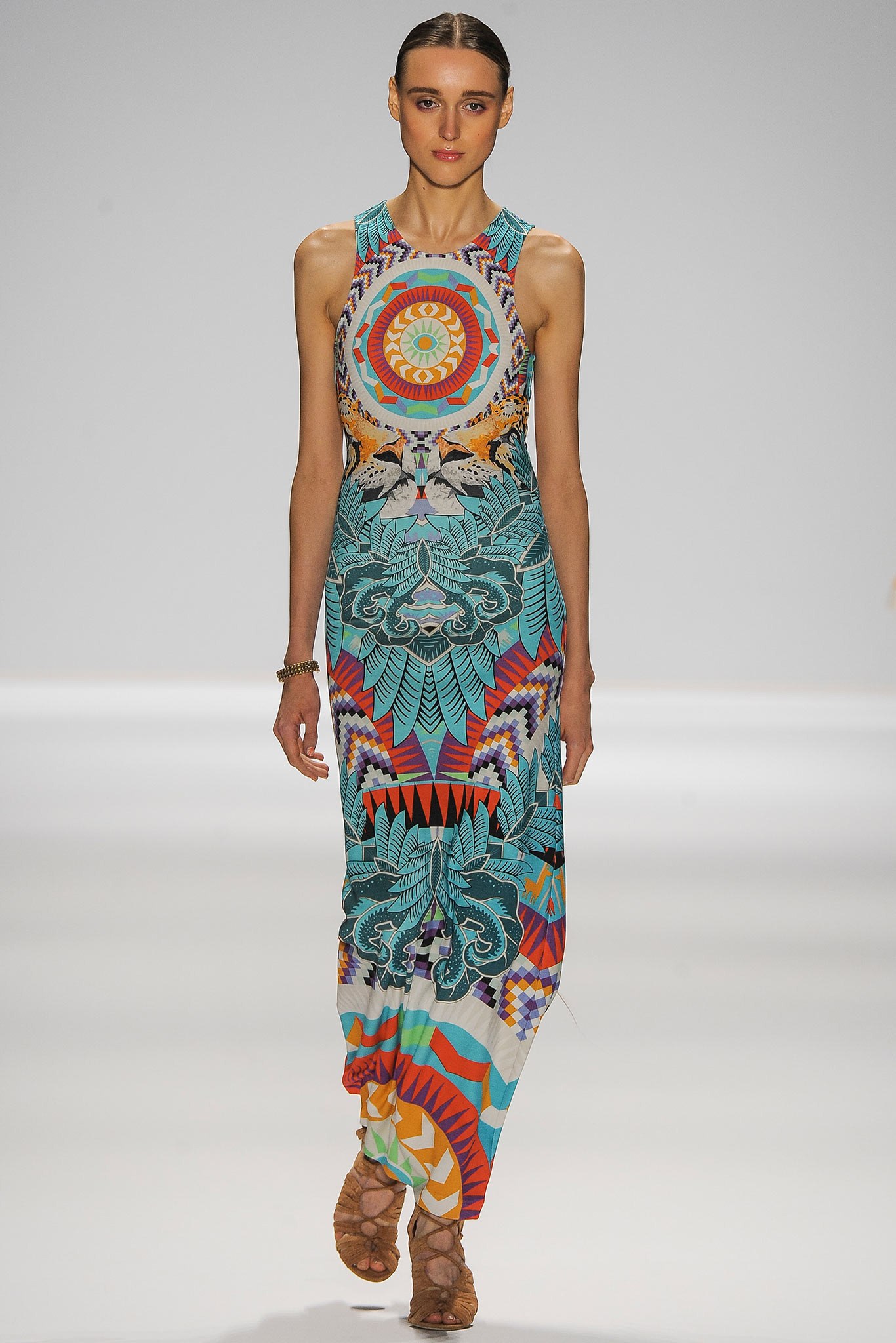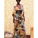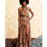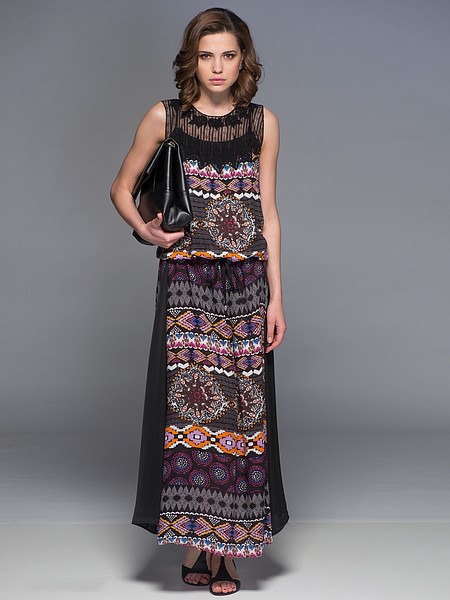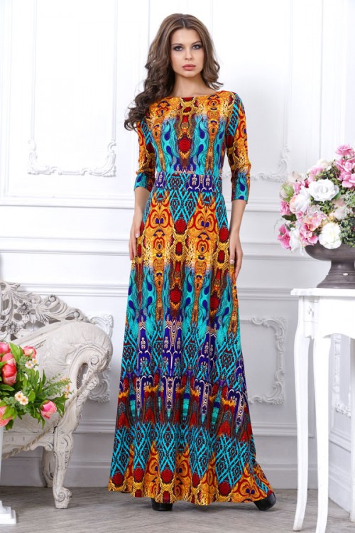 If you want the distinctiveness of hot Africa, choose a long orange dress with a floral stylized print - exactly what you need! Due to the deep cuts on the sides, decorated in lacing, there will be no restraint of movements. Hanging tassels of laces with fringe and open shoulders will be the highlight of the dress, and to complement the image, it is better to wear a pair of bracelets in a shade of the dress pattern and simple sandals.