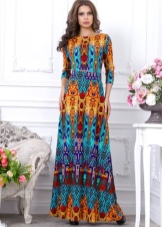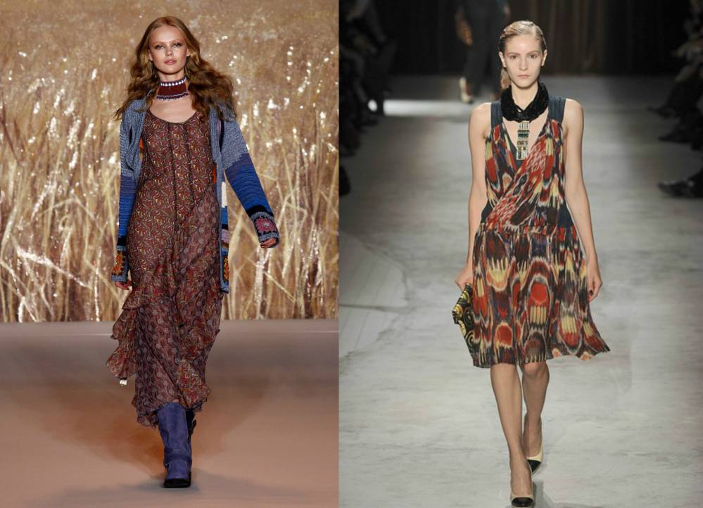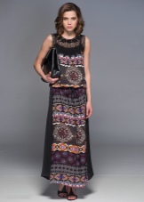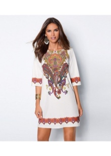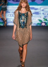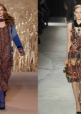 A typical example of the ethno-style of this trend can be called a narrow long dress with a stand-up collar, a tunic dress with wide sleeves, a silhouette trapeze dress and a rectangle. Be sure to have in the image of a wide belt, belt at the waist and sabot.