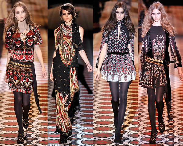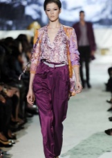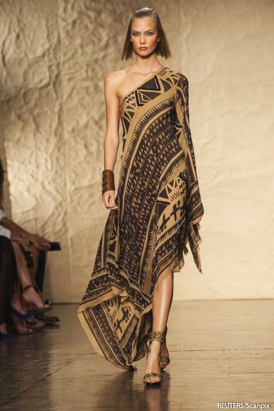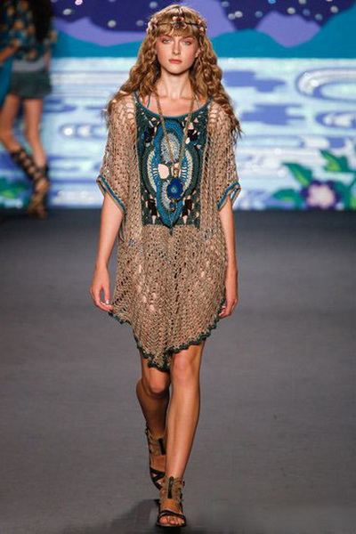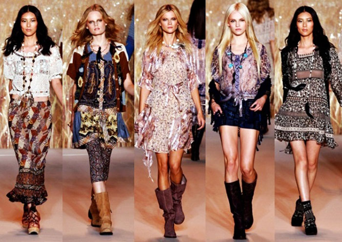 The sets are often made of suede, they are generously decorated with fringe, embroidered with beads, glass beads and combined with chintz blouses and leather vests. Appeal to the schematic images (elements of cave painting) allows you to get closer to the world of ethno-Indian themes.