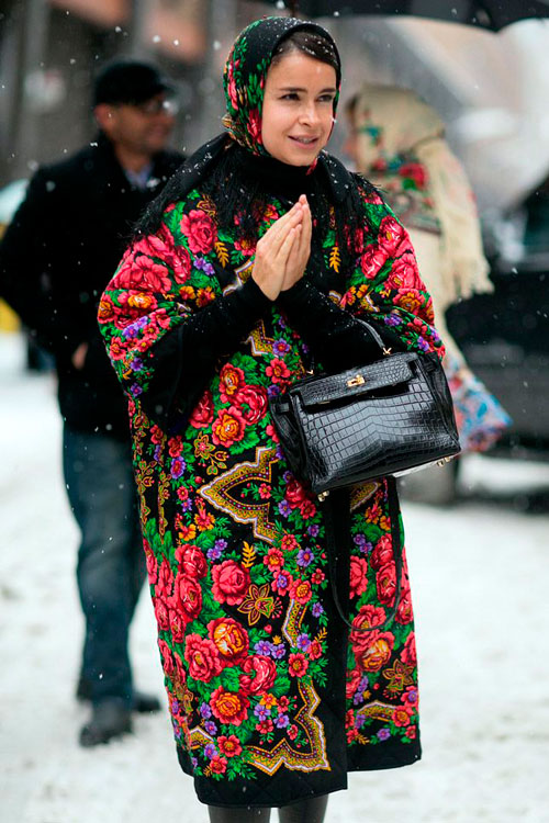 Such things are inherent in red, black, white, green, gold, terracotta and sand shades. Products can be monophonic or with pictures, among which floral, vegetable themes are more relevant. This wardrobe includes outerwear made of sable, ermine, marten, and silver fox.