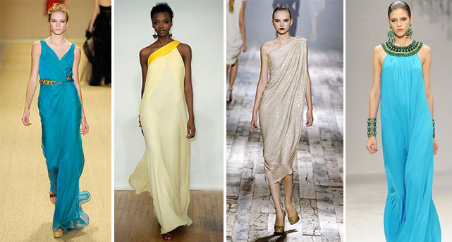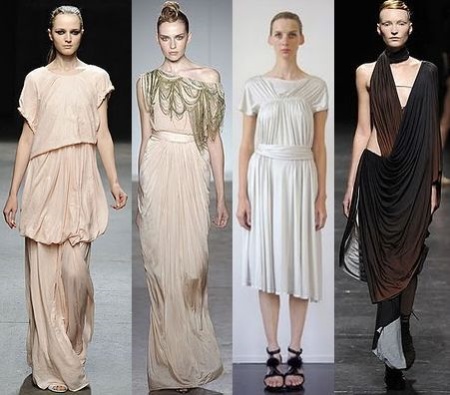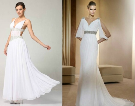 Ideally, if the style provides for a coat, drapery, V-shaped neckline. Often in the image there is a wide belt, pendant, tiara or a special hoop on an elastic band, with the help of which the hairstyles are created in the Greek style. Apparel accessories on the heel are open heels and sandals from numerous thin straps and weaves.
