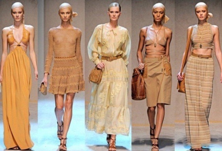 Clothing differs concise cut and free forms. It is convenient and practical. Products have a cut of a trapezoid, a rhombus and a rectangle. The dress can be semi-adjacent or frilly, asymmetrical (on one shoulder). Tops, clear capes and shorts are welcome.