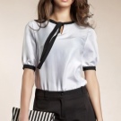 - Blouses.It is preferable to classic options with turn-down collars and small buttons as a fastener. Perhaps wearing strict models with a V-neck or with a frill.