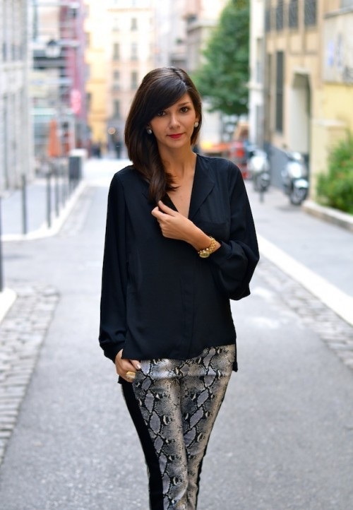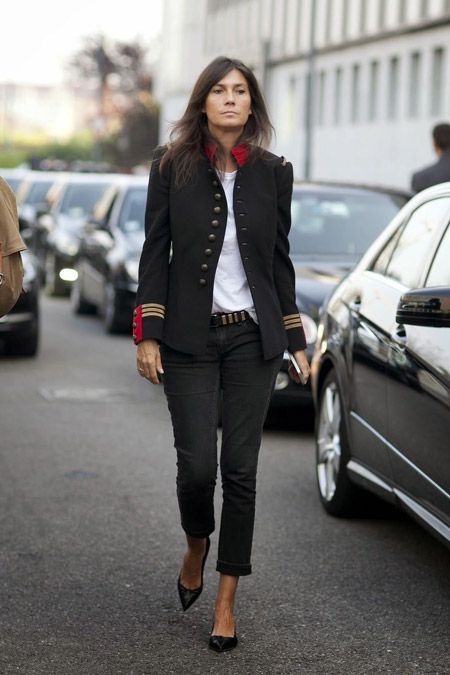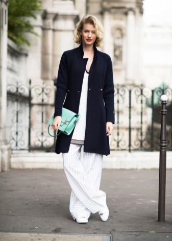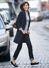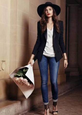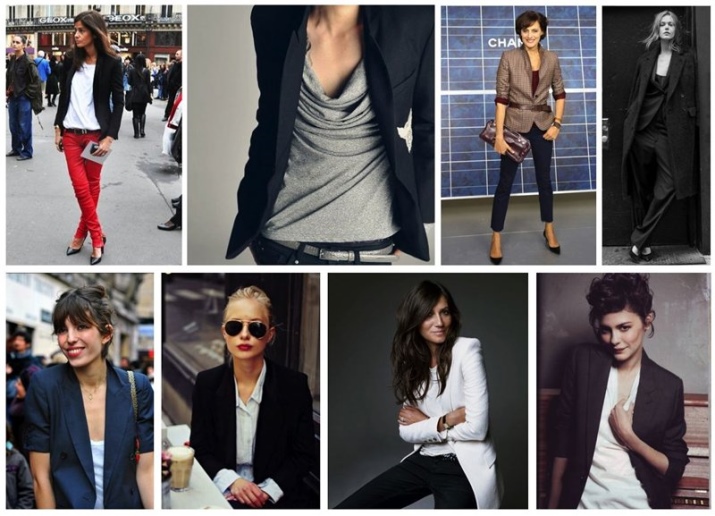 A bright image will help to create a men's jacket (not too wide and without huge shoulders), which is allowed to be worn with a belt. Depending on the width of the latter, it is either tied in a knot (thin) or fastened with a buckle. Rolling sleeves will look great. In the afternoon, a jacket is worn with pants that are contrasted with it in color or jeans. In the evening - both elements must be in the same color scheme. But wearing this wardrobe item with a miniskirt is not recommended.