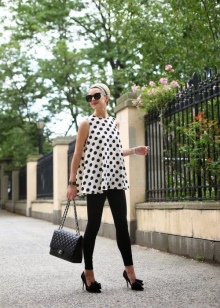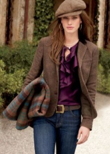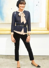 Under the jacket a blouse or light-colored shirt is worn, which is recommended not to fasten the top buttons. Lace or silk top with shoulder straps is also allowed.