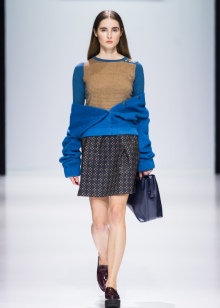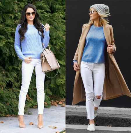Another fashionable bow: a dark blue cashmere sweater in combination with white jeans, sandals on heels and a leather jacket.
