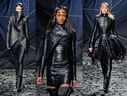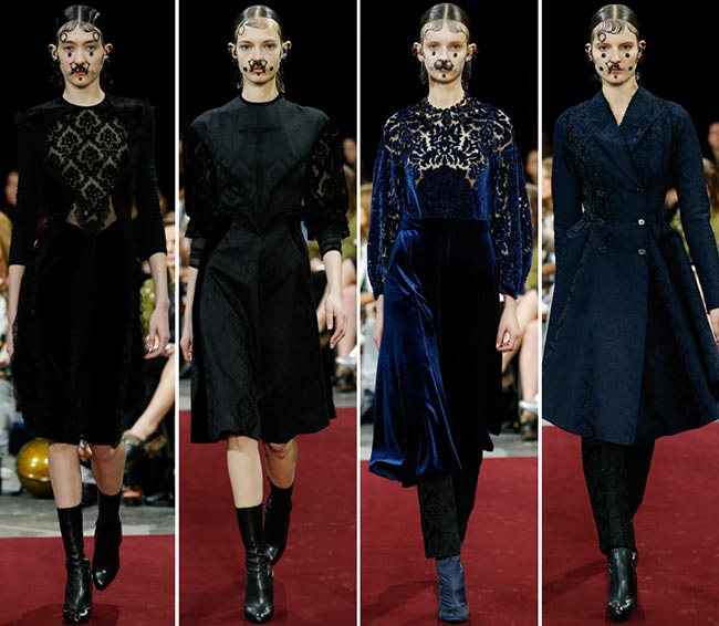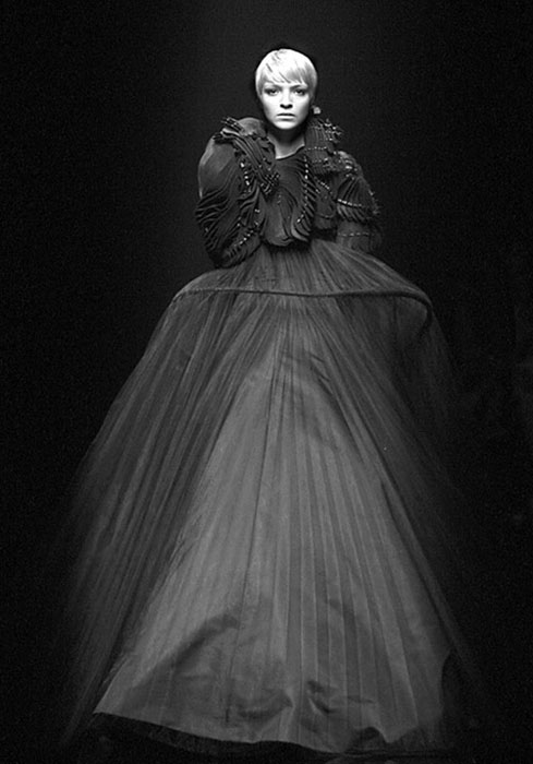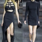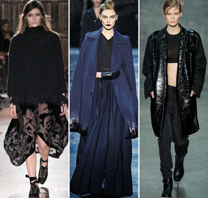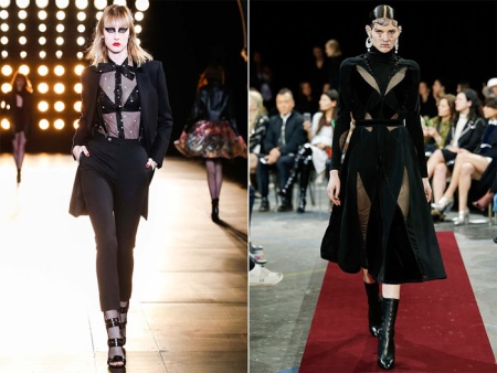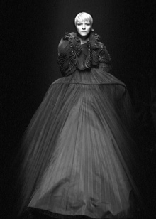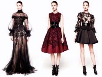 For dresses, silk, velvet, vinyl, mesh leather, denim are used, supplemented by organza, brocade, taffeta, Lurex.
