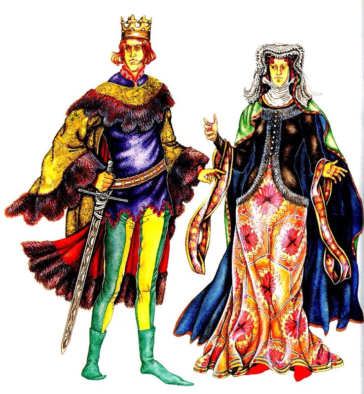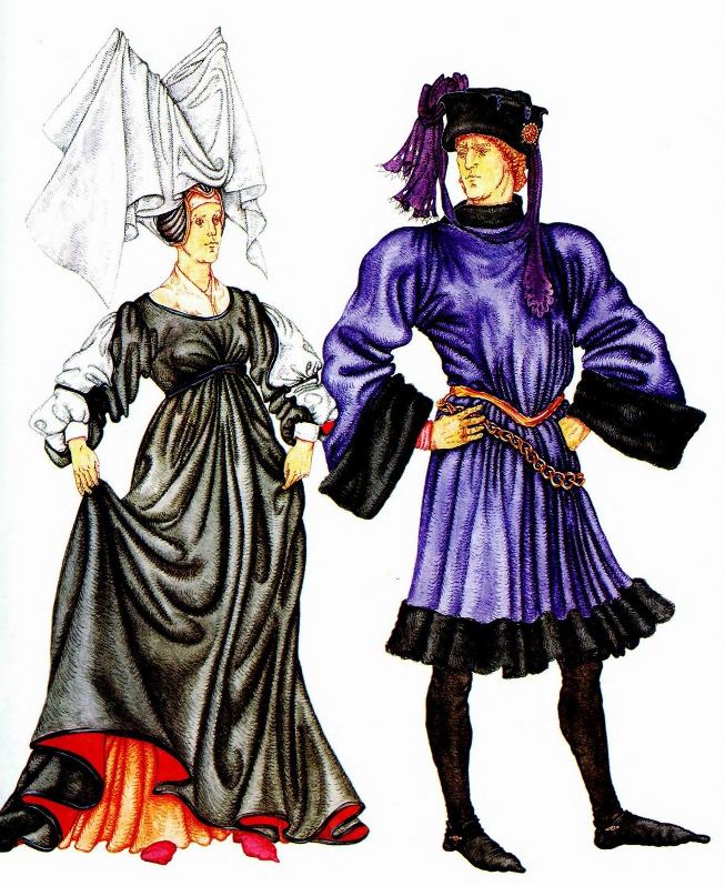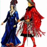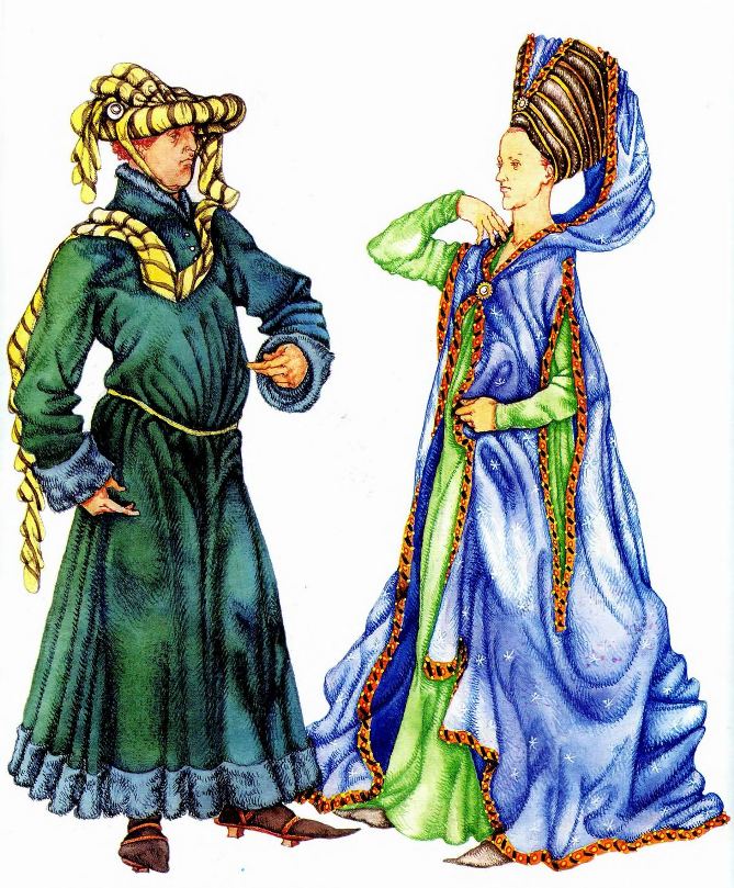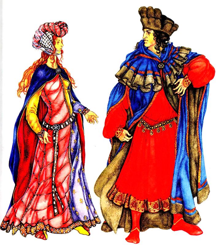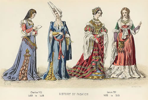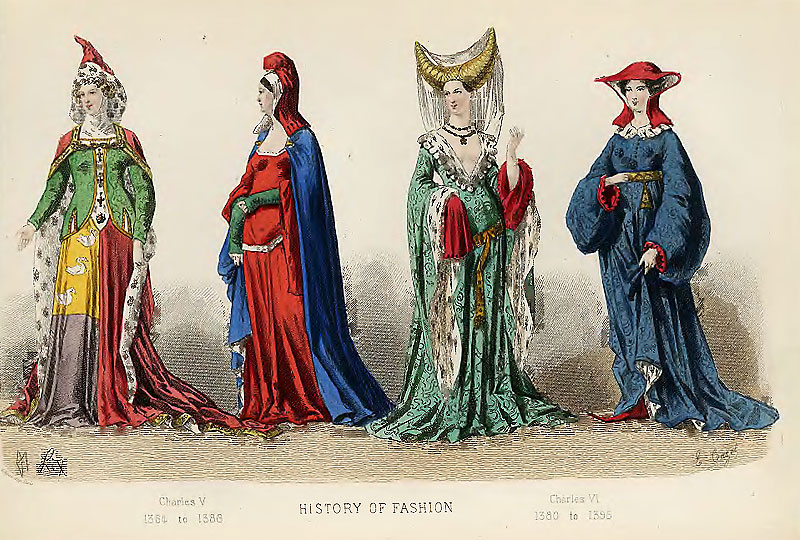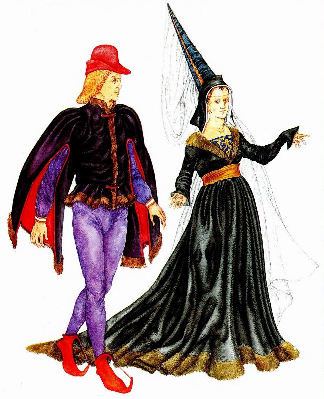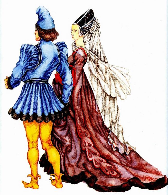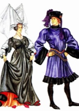 The “barbarous” fashion of the Middle Ages had several options - each class had its own tendencies and preferences. They were united by their elongated proportions and silhouettes. In the trend were shoes with long noses (sometimes up to half a meter), pointed hats, a thin, tightly laced waist, teeth on the edges of the clothes and long loops. The higher the position of the ladies, the longer the train was. Fashion trend was drapery in the abdomen.