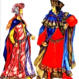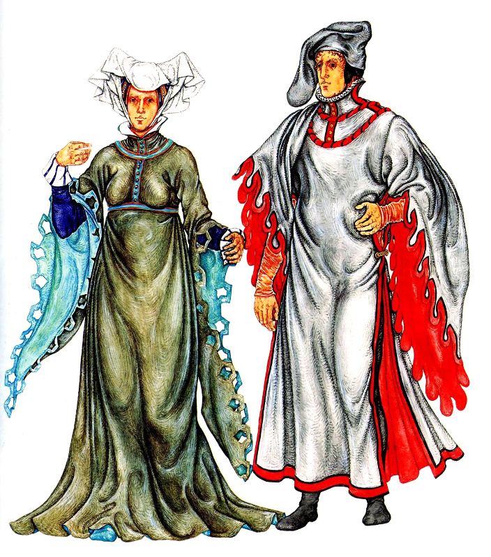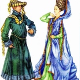 The top outfits were represented by semi-circular or round cloaks, fastened with a massive buckle on the chest.