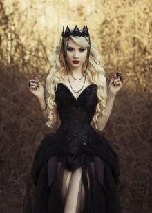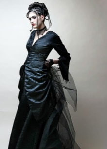 An integral and important part of the image is the hairstyle. In ready it is, as a rule, straight hair the color of a raven's wing (rarely it is red or ashen). Romantic direction allows curls and lush hairstyles.