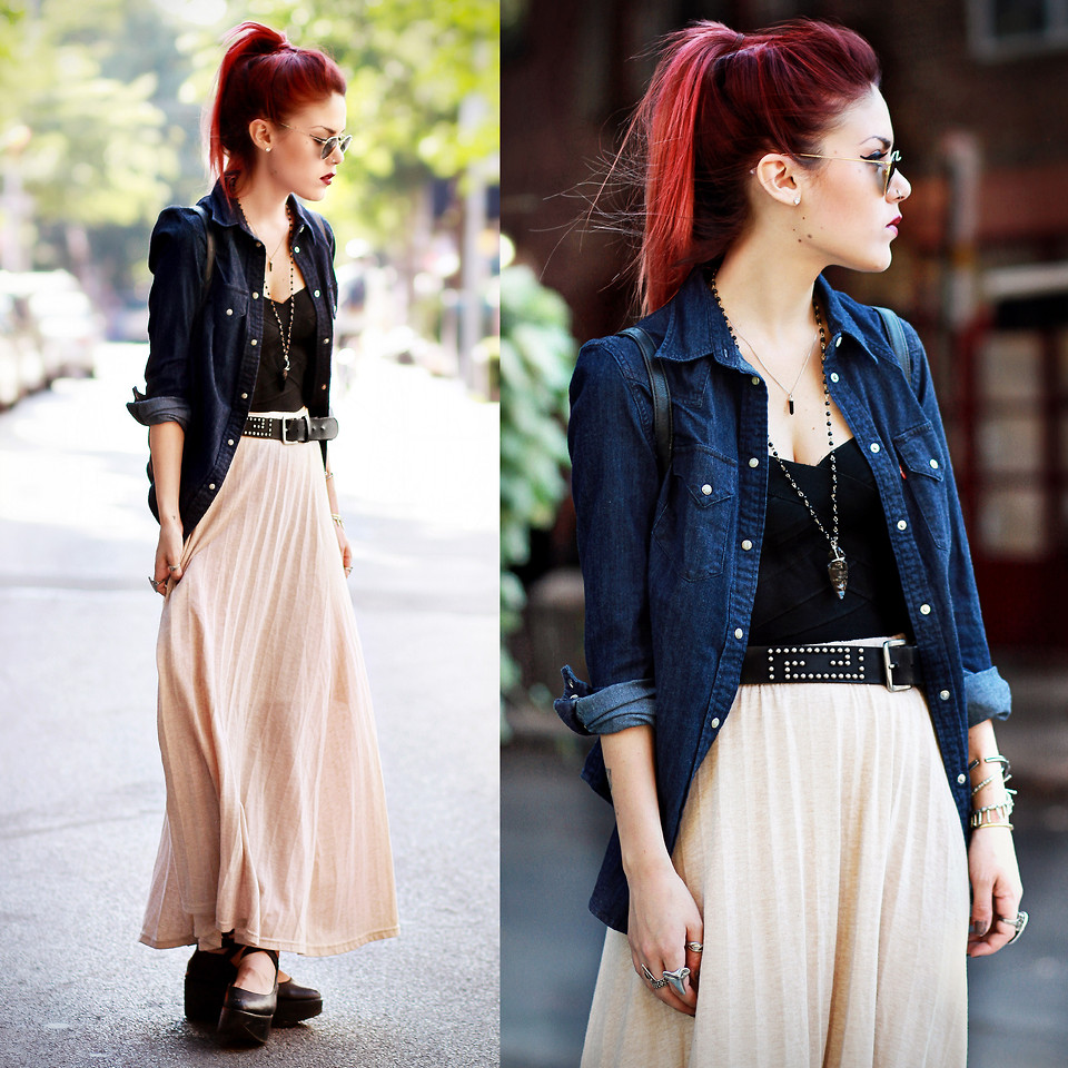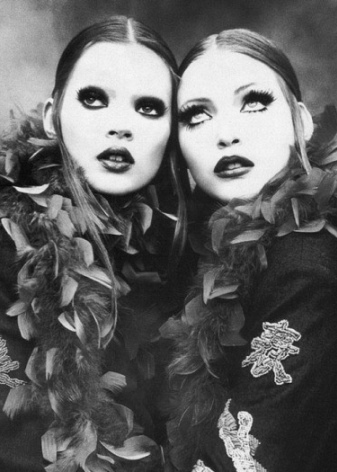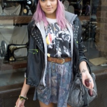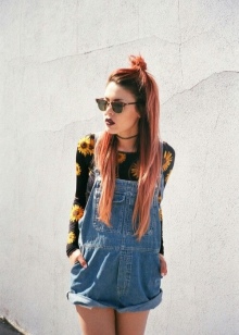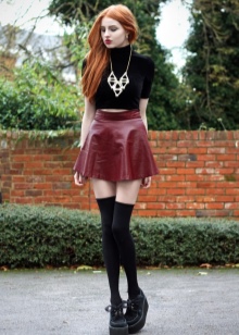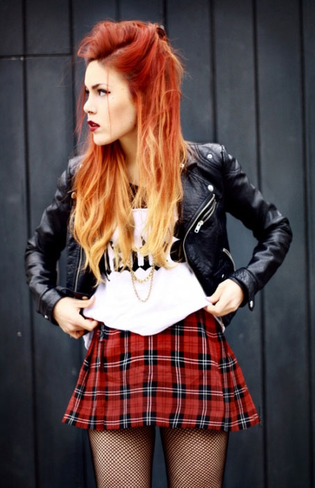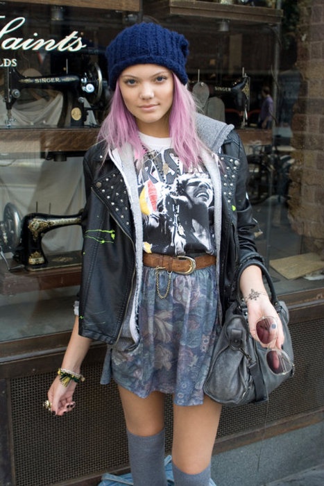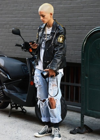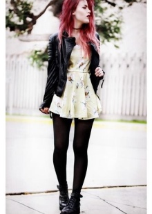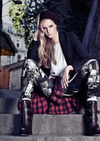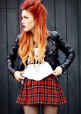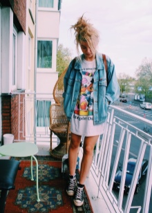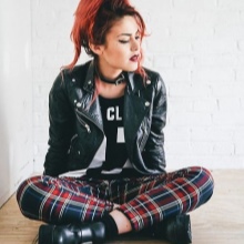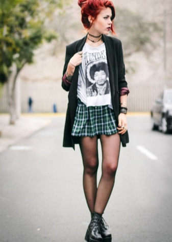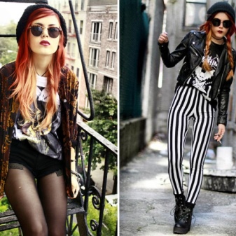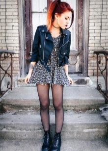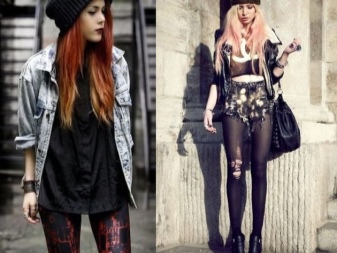 The combination of denim or knitwear with genuine leather, extravagant hairstyle, belt-corset and eye-catching makeup - these are the basic techniques of punk grunge. Another example describing this variety is an image consisting of a coarse jacket with army boots and a light chiffon dress, or a combination of a torn men's t-shirt and a luxurious romantic skirt.