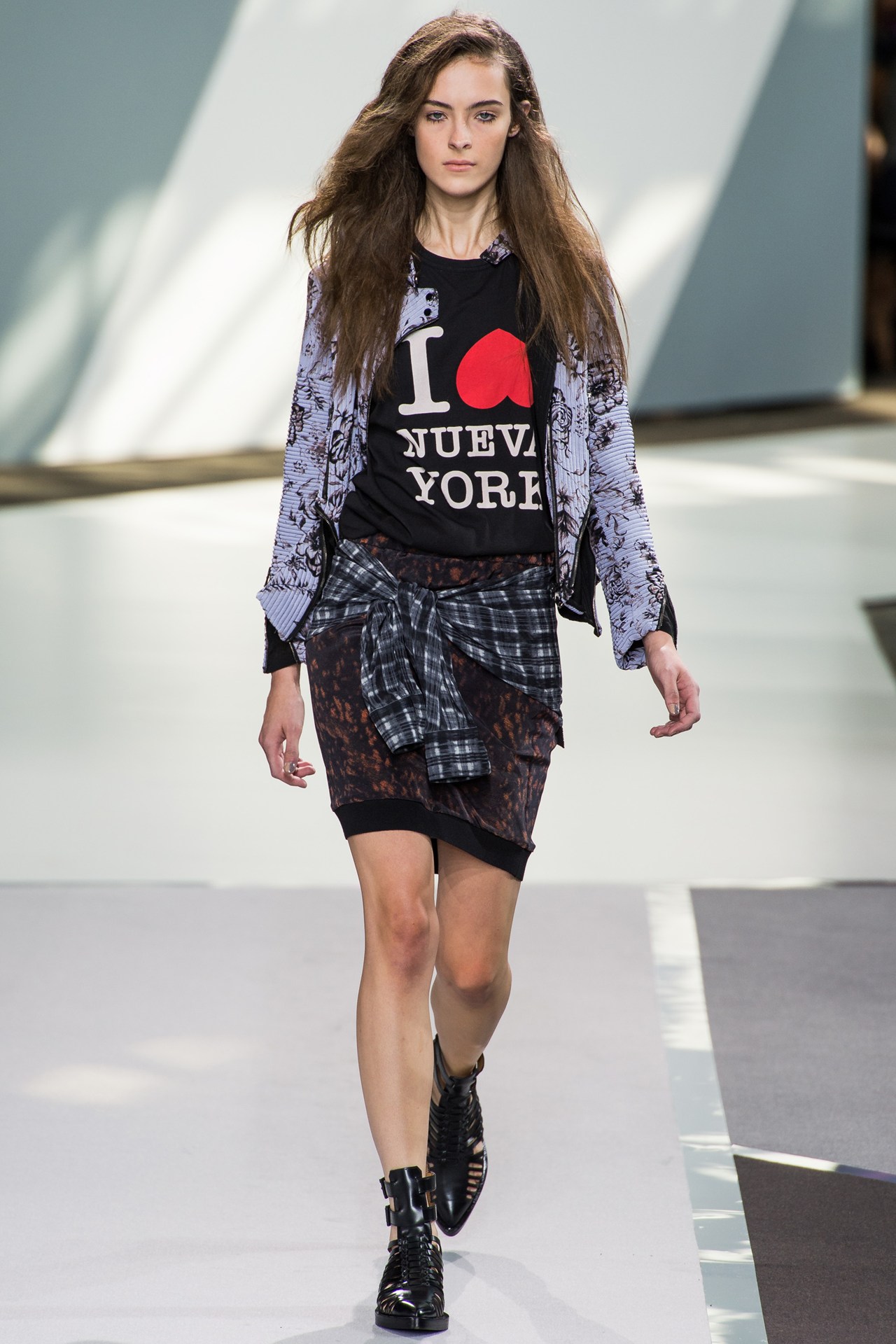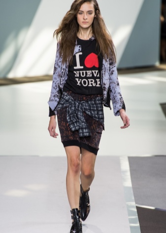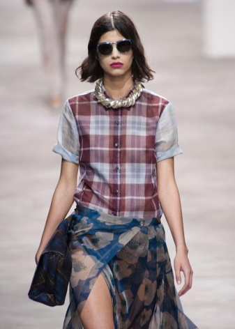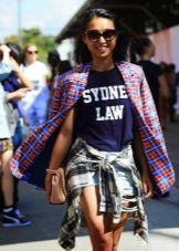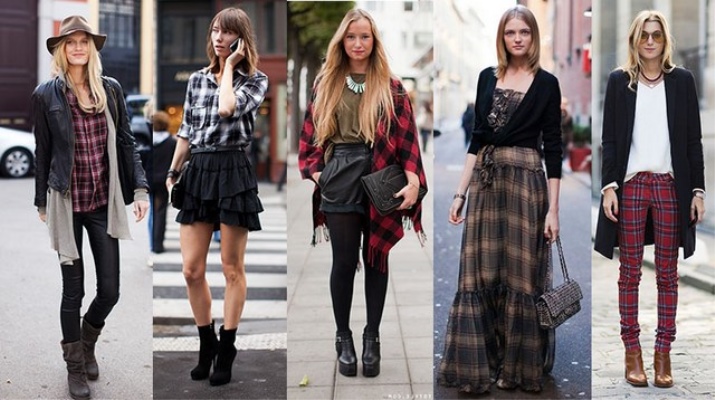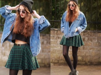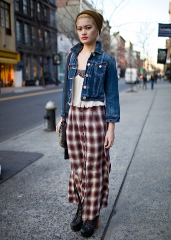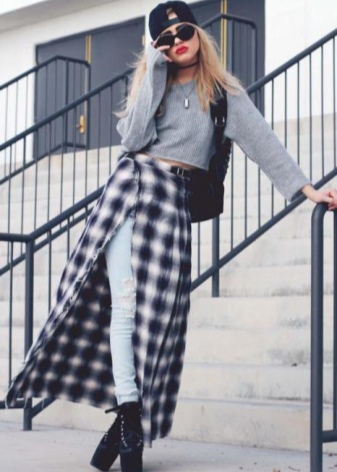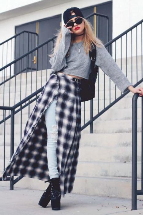 The image allows feminine skirts, including a print in a cage. Their cut is different, but the length should be short (mini, straight, sun). It looks interesting long checkered kilt on top of the skin and elements of scrap (inscriptions, fonts, fragments of phrases, blots, etc.).