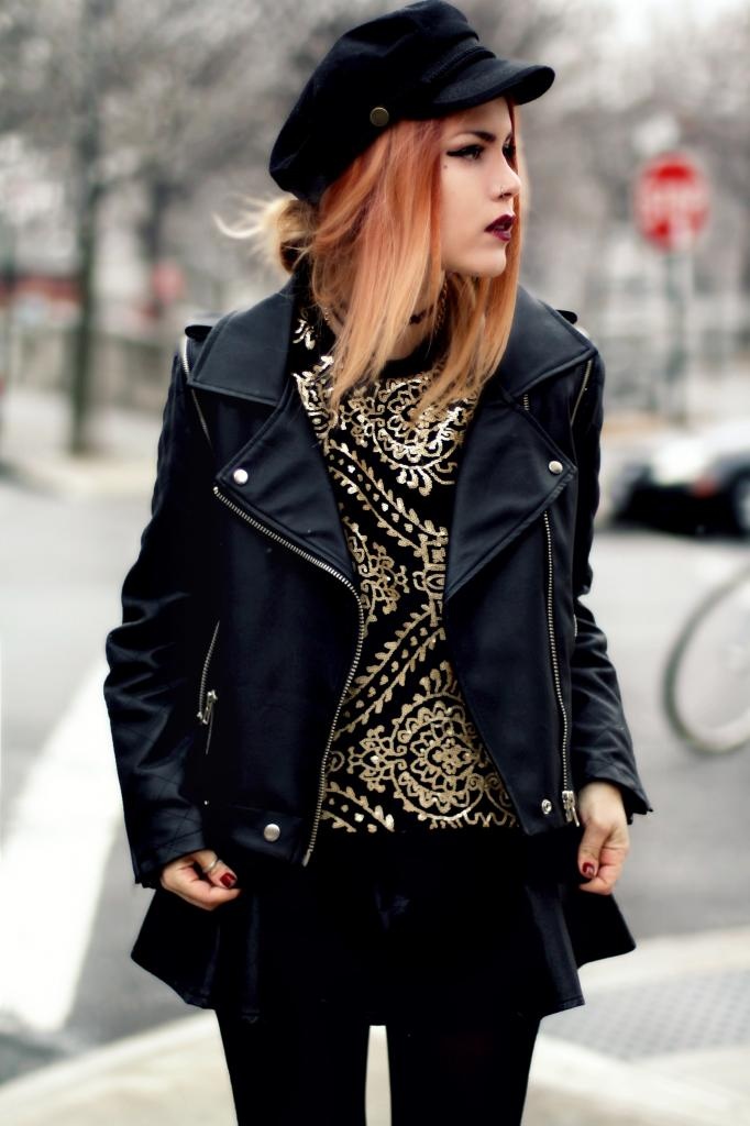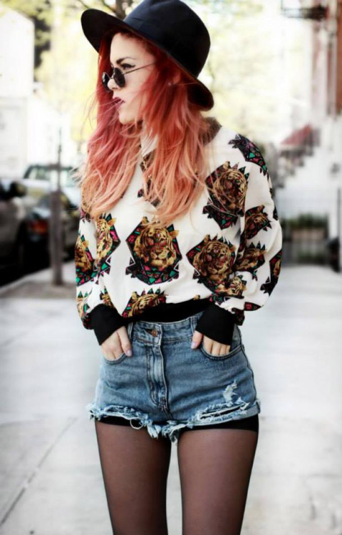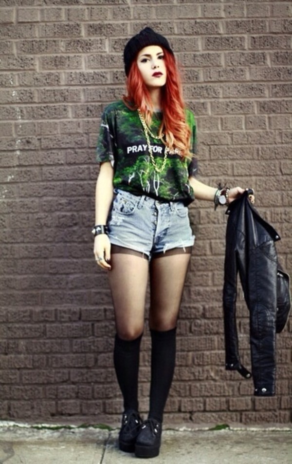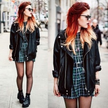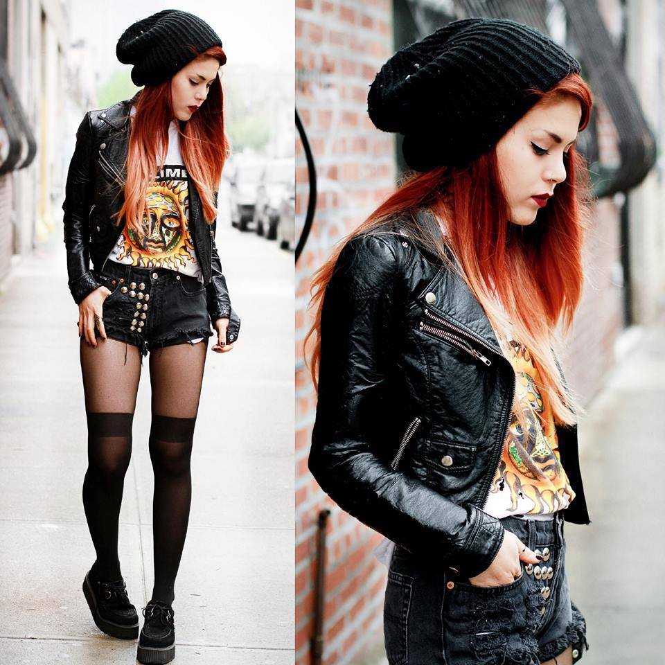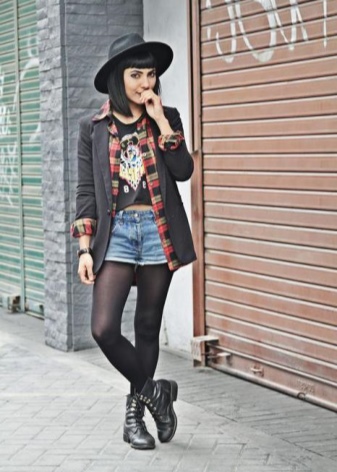 A modern rebellious style may consist of a jacket with cuffs and a checkered collar, worn over a top with a print and denim shorts, black tights, lace-up shoes, and a black men's hat.