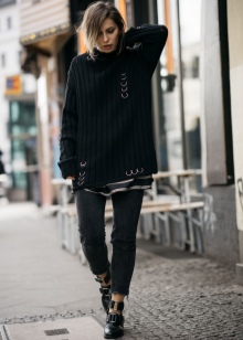 - Plain sweater-oversize or cardigan. In the trend model with a large viscous gray, black, marsh tones. They should be somewhat baggy and look like "from someone else's shoulder." A recognizable style element will be a sweater with lowered hinges and stretched sleeves. These products are worn over t-shirts, sweatshirts and are combined with jeans and tight pants.