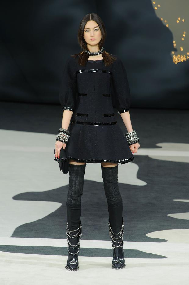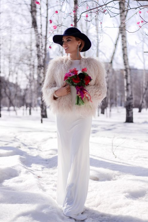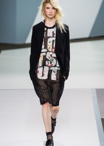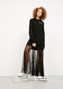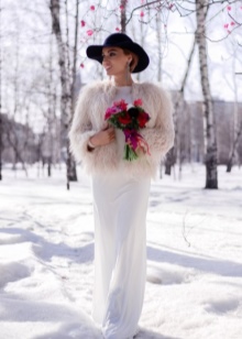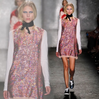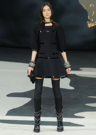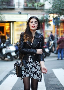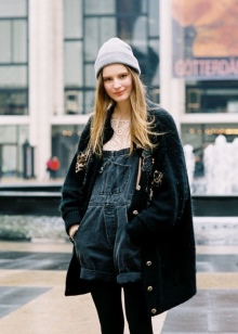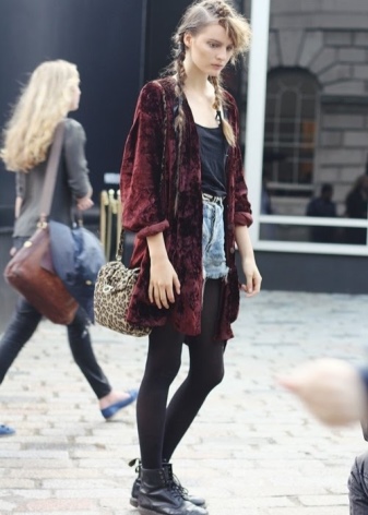 In the cold season, you can wear a down jacket or a fur coat made of arctic fox, a long knitted sweater and black tight pants, completing the bow with boots with a wide bootleg. The combination of a short dress with a sheepskin coat looks extraordinary.