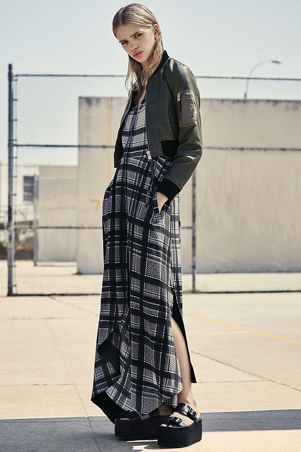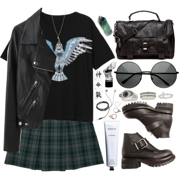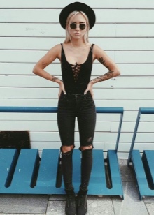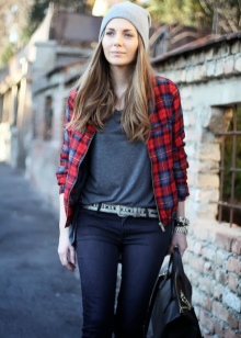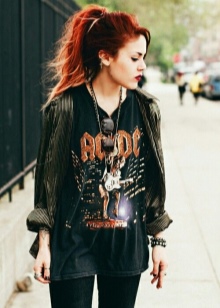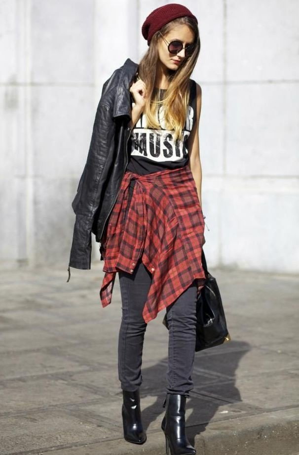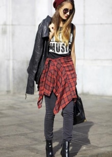 A sloppy rock grunge can be made up from an elongated T-shirt, sweater and loose jeans. If you want a more creative image, you can wear plaid slim green pants with a black top and leather leather jacket. It is possible to finish the bow with black shoe boots on a low heel and a hat of a similar shade.