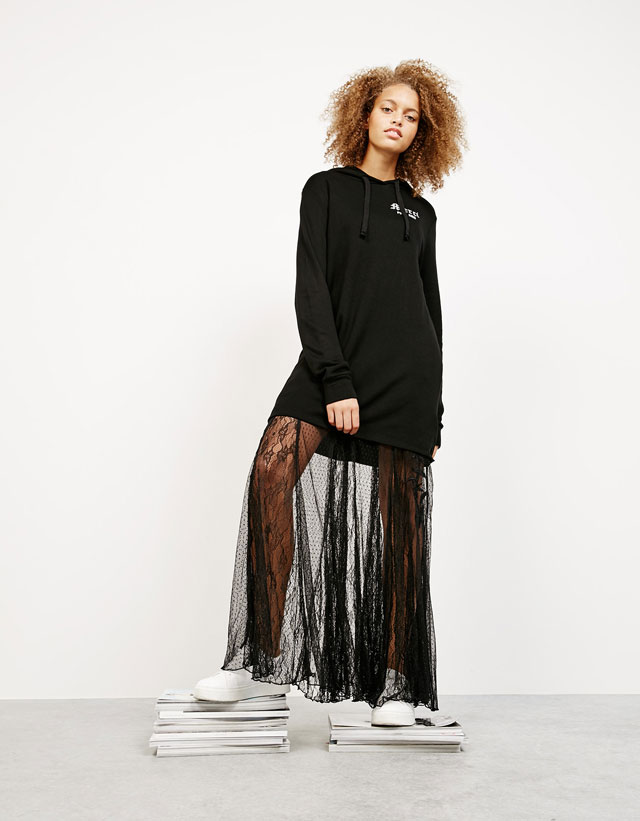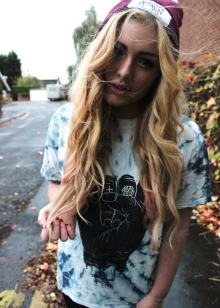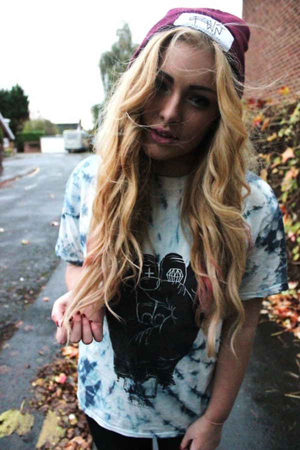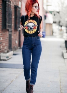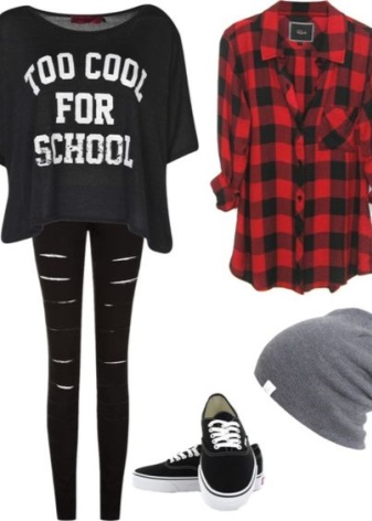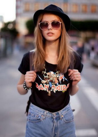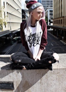 - Knit T-shirt or T-shirt with a large print. Cut often free, straight. This element of style is often decorated with inscriptions, letters, skulls, stickers of favorite groups, singers and less often with abstract motifs.