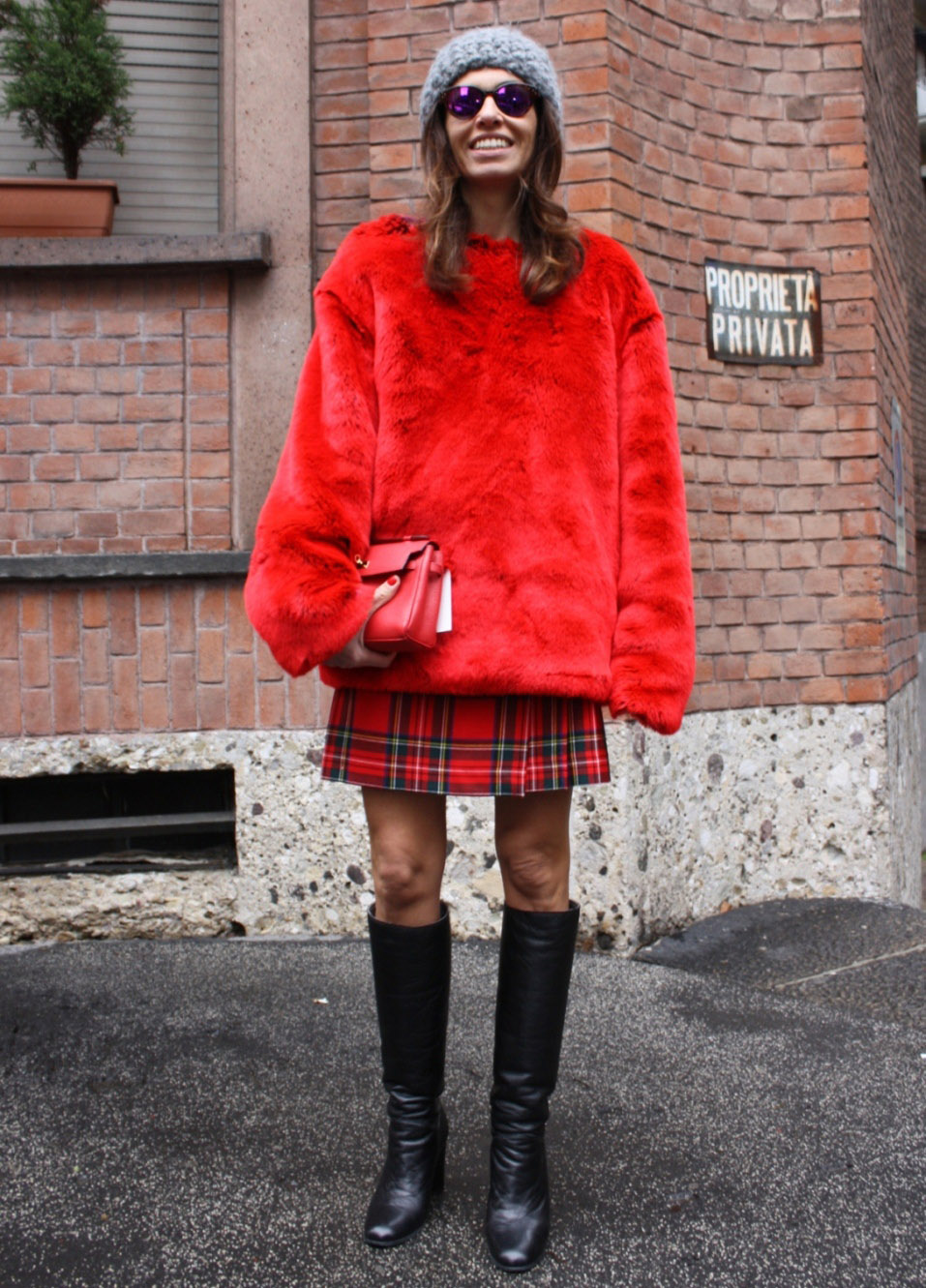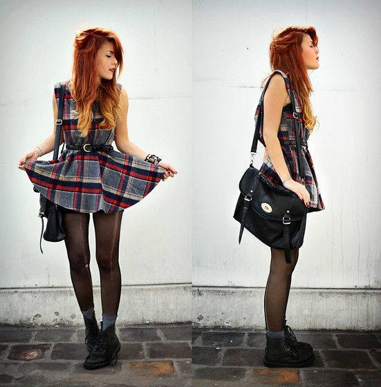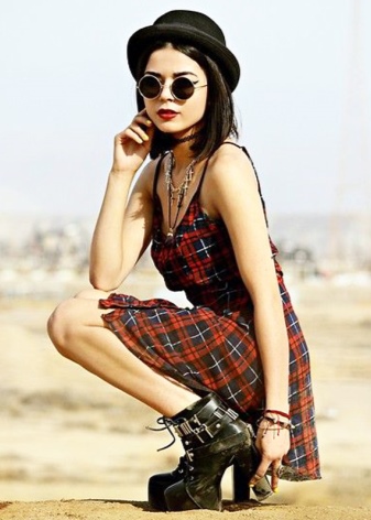 A short gray dress in a red and black check sleeveless can be complemented with black tights “with arrows”, gray socks and boots. Waist better accent leather belt with a metal buckle.